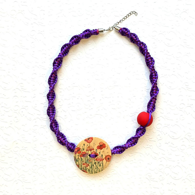 Unikatna ogrlica – Livada makova. Kombinacija makrame tehnike i perla sa gumbom.