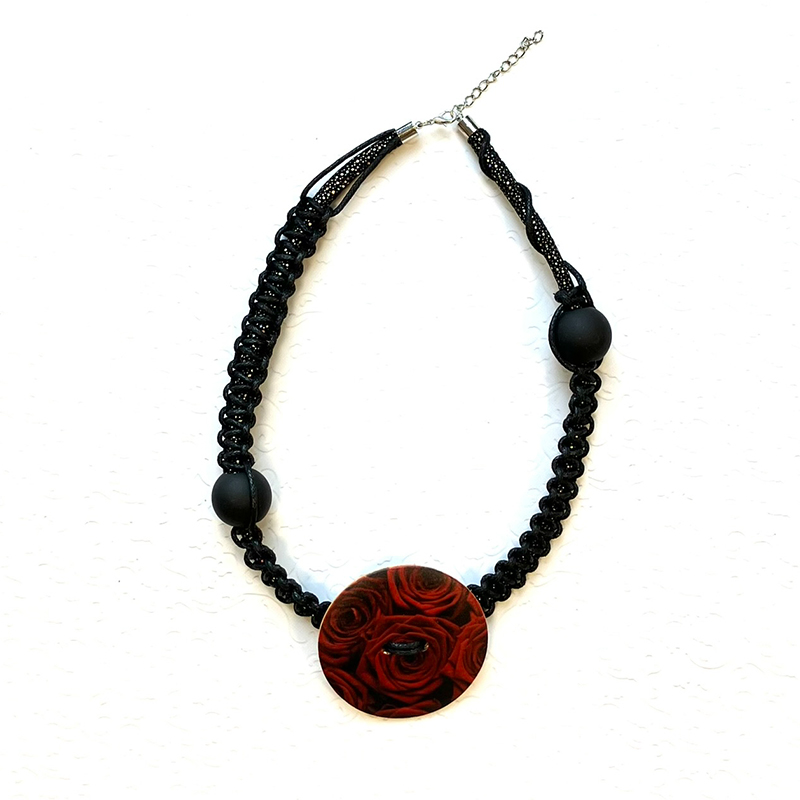 Unikatna ogrlica – Ruže. Kombinacija makrame tehnike i perla sa gumbom.